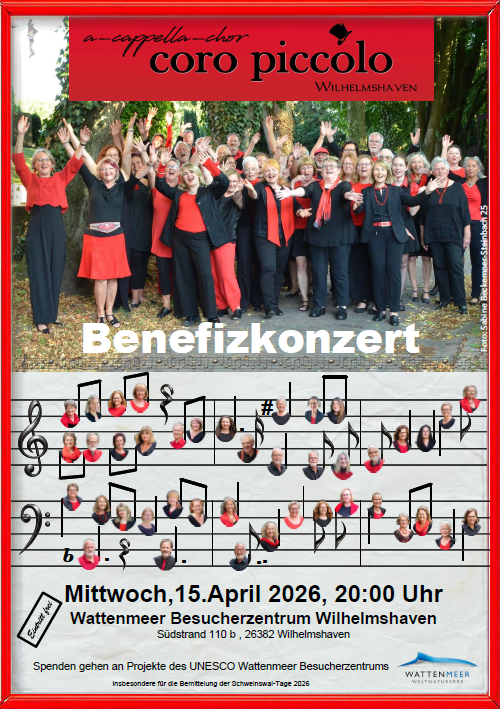 Auch in diesem Jahr hat der Chor mehrere Benefiz-Konzerte geplant. Das erste Konzert findet am Mittwoch, den 15.04.2026, um 20.00 Uhr, im UNESCO-Weltnaturerbe Wattenmeer Besucherzentrum am Südstrand, im Rahmen der Veranstaltungen zu den 10. Wilhelmshavener Schweinswal-Tage statt. Der "Coro Piccolo" möchte die Zuhörer an diesem Abend auf eine bunte, weite Reise mitnehmen.